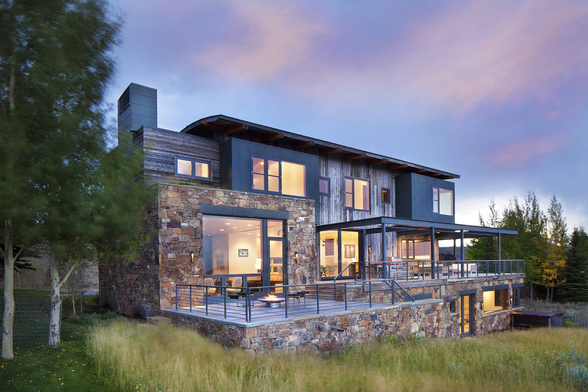 Moss rock, pelapis papan kandang pedesaan, dan panel seng memadukan struktur kontemporer rumah ke dalam latar alami dengan serangkaian tekstur dan pola yang melengkapi lanskap sekitarnya. Banyak fitur ramah lingkungan juga diintegrasikan ke dalam desain rumah, termasuk atap hijau dan panel surya.