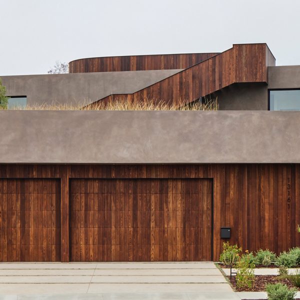Dari belakang, dua tingkat rumah dibuat jelas dari struktur bahan yang berbeda. Alasnya dibalut dengan pelapis Thermory Ash vertikal bernoda kenari, sedangkan tingkat atas menjadi massa padat dengan plesteran berwarna tanah.
