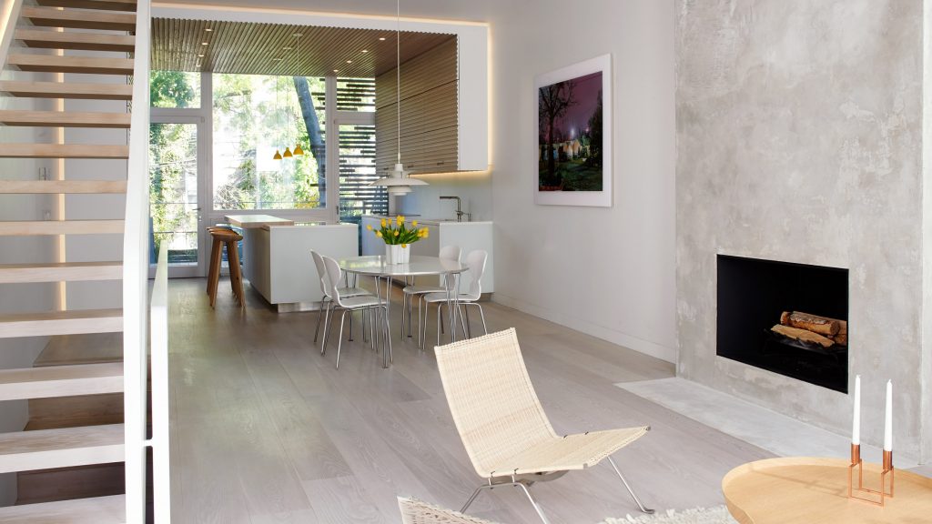 Di dalam rumah yang ramping, tim menggabungkan warna dan bahan pucat seperti kayu ek putih.