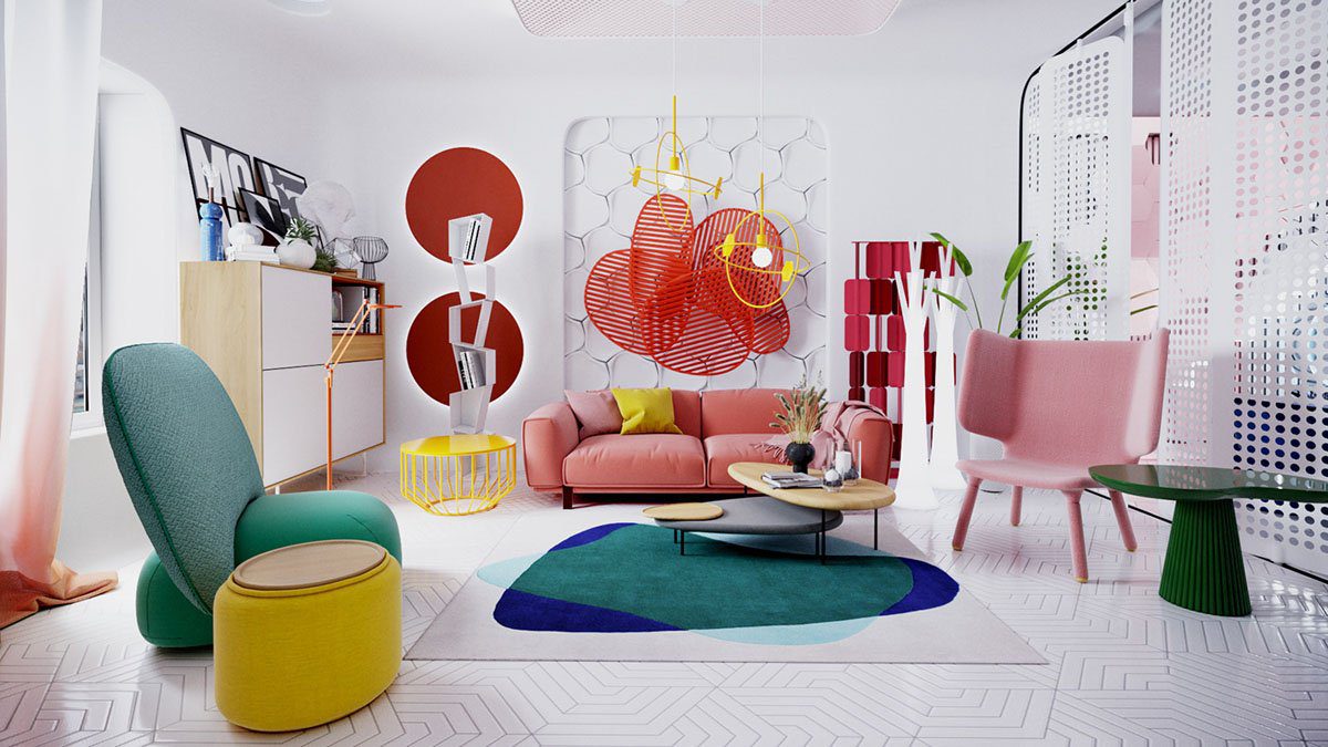 Kursi beraksen hijau yang tidak biasa dan meja samping kuning menciptakan tempat yang unik untuk presentasi di depan kamera. Permadani modern yang unik berfungsi sebagai perangkat penghubung, menghubungkan semua komponen ruang tamu yang berwarna-warni menjadi satu. Ubin lantai geometris sangat kontras dengan motif permadani melengkung dan menyebarkan pola kontemporer ke seluruh ruangan.