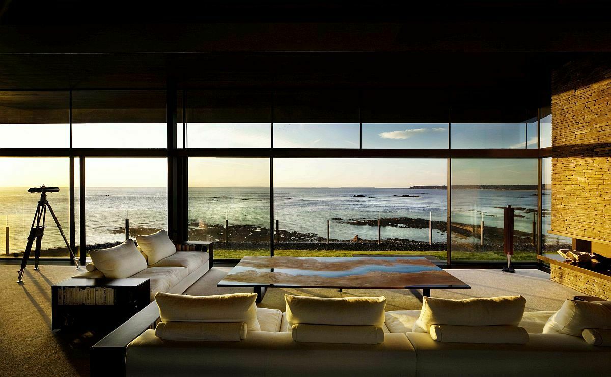 Dinding batu dan batu tulis, dinding kaca setinggi langit-langit, dan atap melengkung menjadi ciri ruang tamu yang mencolok dan luas. Jalan setapak tertutup dengan dinding kaca menghubungkan area publik dan privat.