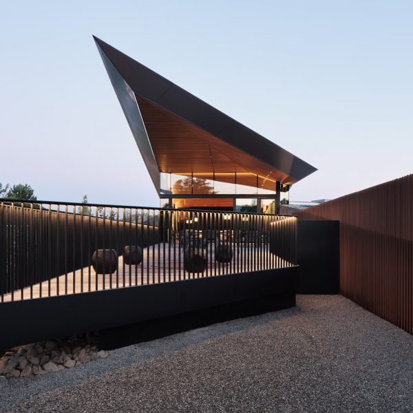 Bangunan satu lantai memiliki denah sudut dan terselip di situs miring. Dindingnya terbuat dari kayu, kaca, dan batu.