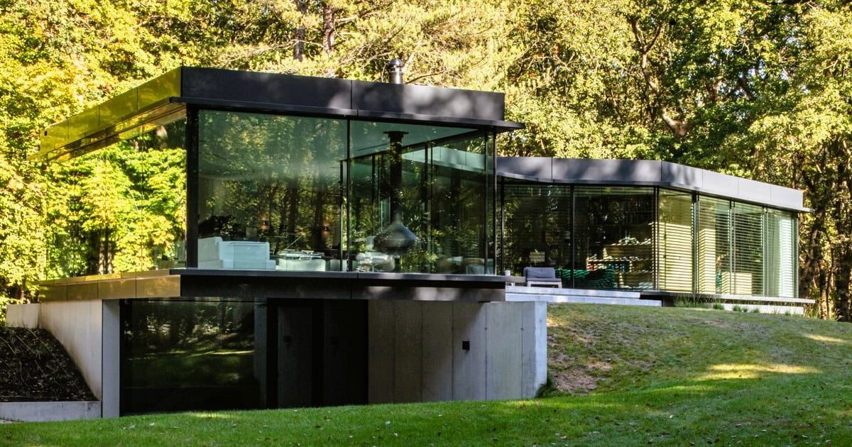 Villa A oleh Paul de Ruiter Architects adalah hunian dua lantai yang terdiri dari satu tingkat di atas tanah dan satu lagi terkubur di dalam lanskap. Akses ke aula masuk transparan yang luas diperoleh melalui area yang menjorok, dari mana tangga mengambang mengarah ke lantai dasar, ruang tamu vila. Tingkat ini memiliki ruang tamu yang luas, dapur yang terletak di pusat dengan ruang makan, ruang belajar, dan kamar tidur utama dengan kamar mandi dalam. Tata letak ruang tamu yang miring memberikan pemandangan alam sekitarnya yang berbeda dari setiap kamar. Sedikit ketinggian lantai ini di atas permukaan tanah menciptakan perspektif yang unik seolah-olah hidup di antara batang pohon dan menjadi bagian dari hutan.