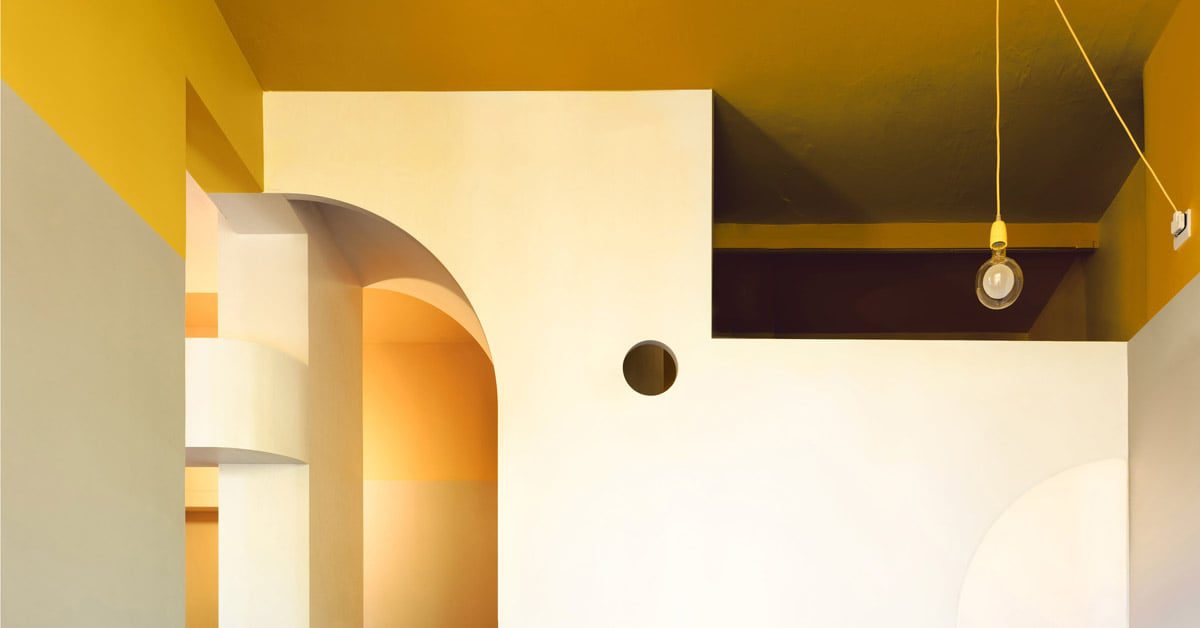 Bantal berwarna di bangku merujuk pada pintu masuk gedung di dekatnya, sedangkan datum kuning cerah yang membentang di sekitar ruangan adalah kebalikan dari dinding yang dicat di tangga bersama rumah petak.