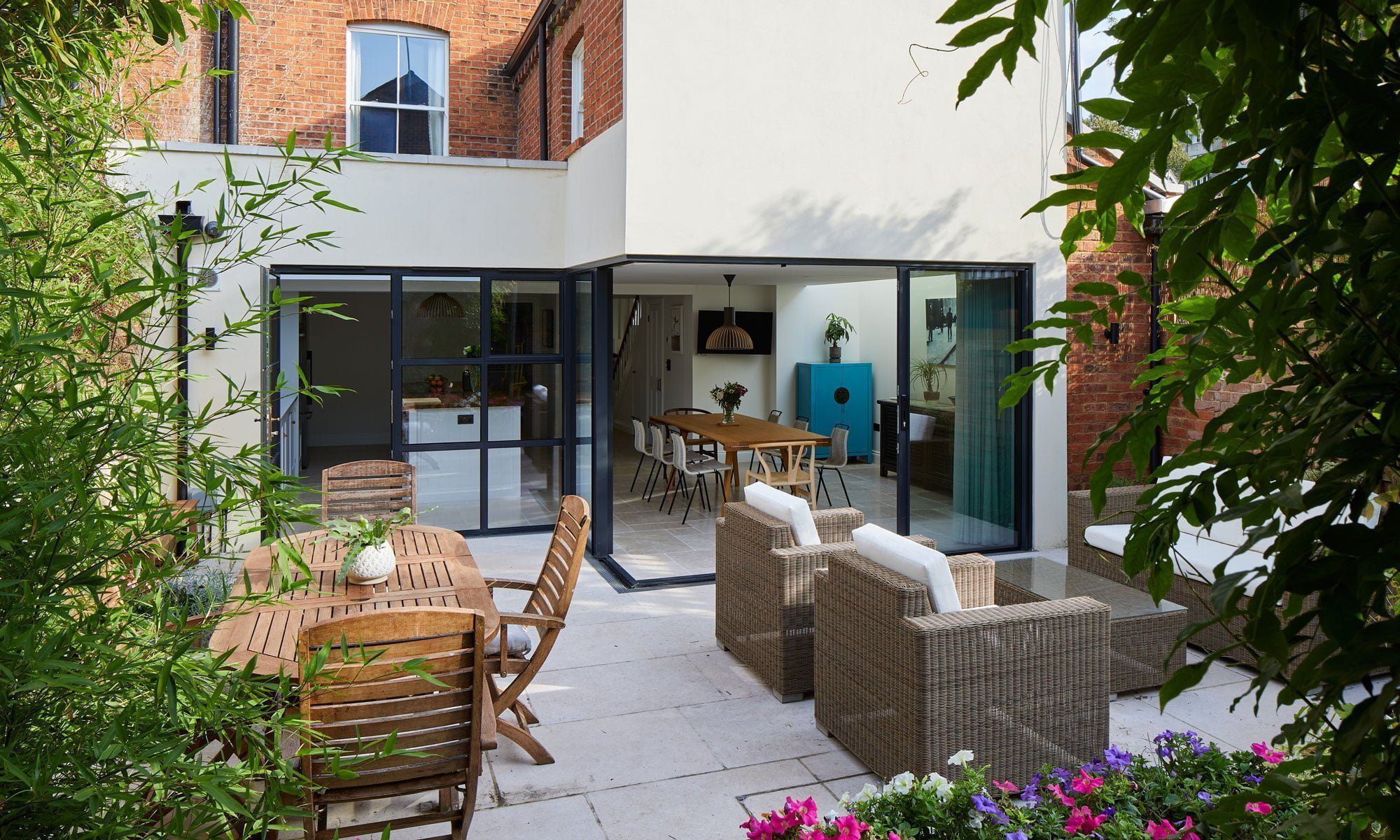 Dalam ekstensi kaca sampul baru, pintu geser terbuka di sekitar sudut sehingga menghilangkan kebutuhan akan rel besar. Ambang batas rata dan memilih lantai yang sama di seluruh menciptakan hubungan yang mulus antara zona dalam dan luar ruangan.