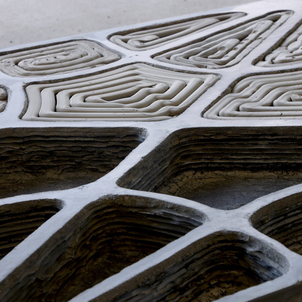 Bekisting menciptakan geometri internal, yang dioptimalkan untuk memperkuat panel di sepanjang garis tegangan utamanya dan memberikan kekuatan yang diperlukan untuk membuat segala sesuatu mulai dari dinding hingga seluruh atap, sekaligus secara drastis mengurangi jumlah beton yang dibutuhkan dalam prosesnya.