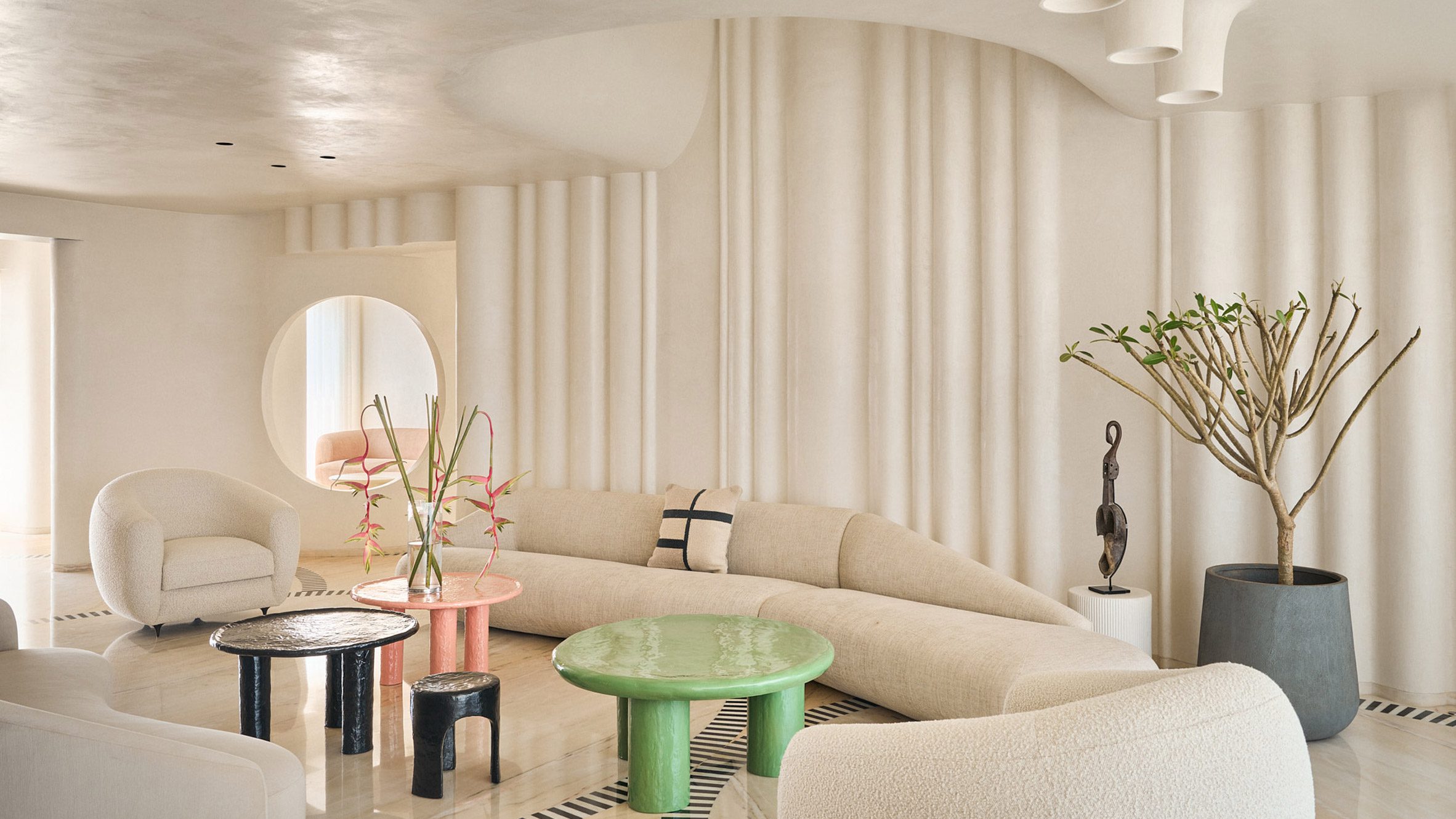 Palet warna dipilih untuk menyatu dengan dinding sehingga bentuk pahatan dan bentuk melengkung menjadi titik fokus, sedangkan boucle dan tekstur kapas menghadirkan ketertarikan dalam hal sentuhan.