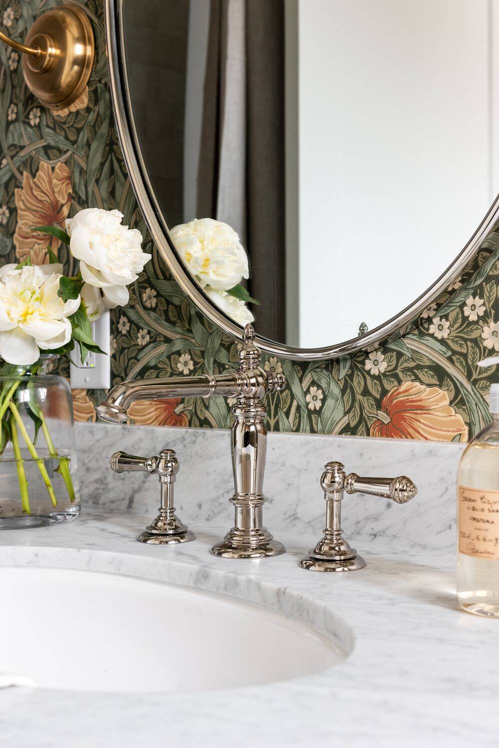 Desain faucet tradisional dengan dua pegangan membuat tampilan yang indah di kamar mandi. Lengkapi dengan wallpaper bunga yang kaya untuk mendapatkan kesan vintage, tidak peduli seberapa besar atau kecil ruangnya.