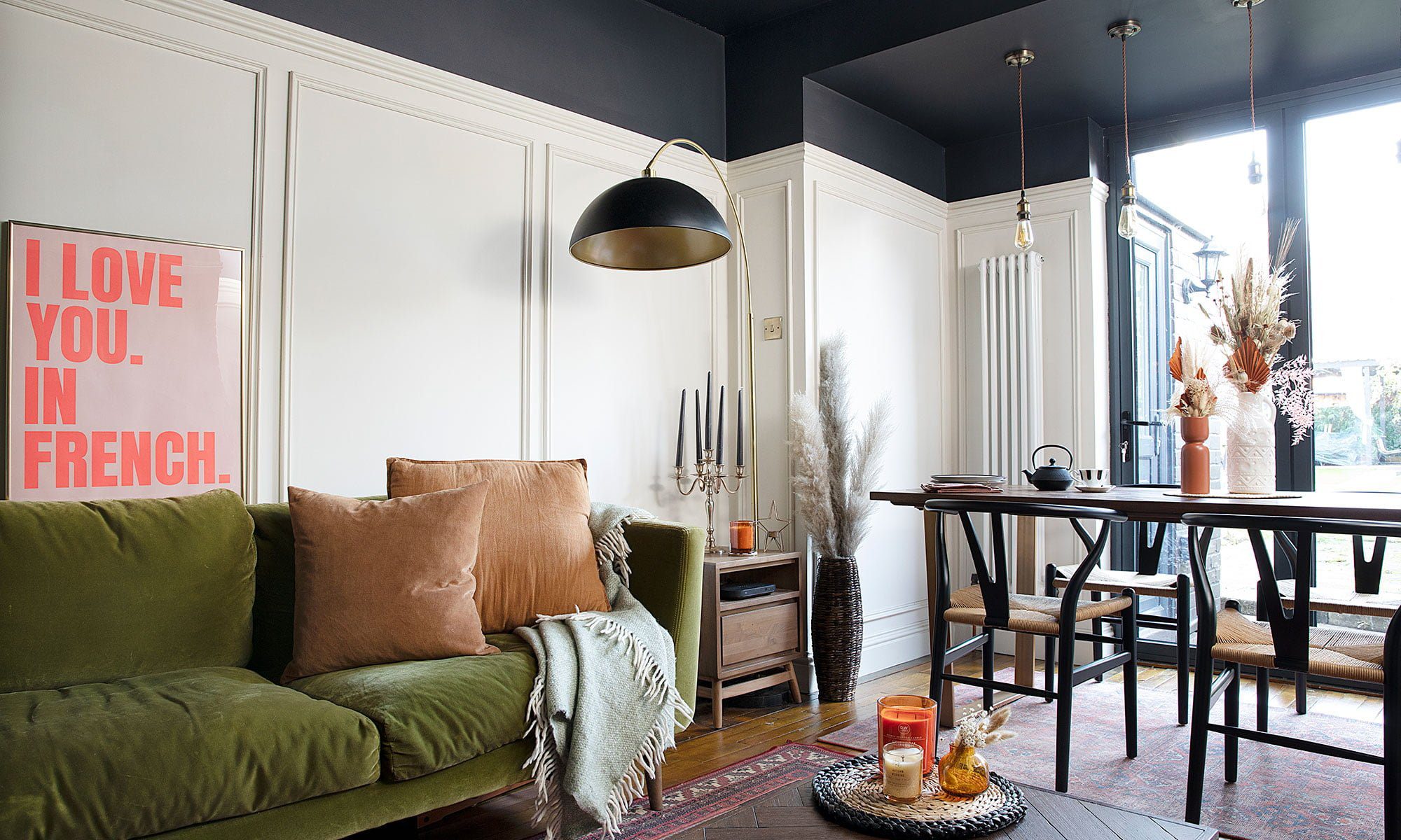 Penggabung memasang ide panel dinding, yang terlihat sangat elegan dan memicu sofa beludru hijau dari sofa.com dan lampu Arc dari BHS. Memilih permadani gaya Persia yang sangat besar membuatnya terasa lebih nyaman dan menambahkan warna hangat.