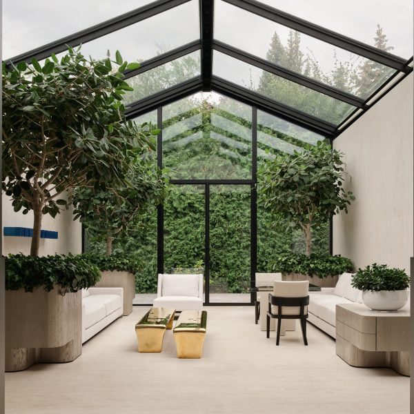 Sebuah konservatori dengan bagian depan dan atap berlapis kaca digunakan sebagai area penerima tamu untuk menyambut tamu, di mana area tempat duduk dengan pepohonan pot besar.