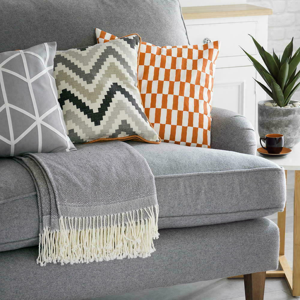 Di sini, ide sofa ruang tamu abu-abu menggunakan aksen warna cerah untuk mempercantik tampilan. Bantal oranye terang berada di sebelah desain yang melanjutkan warna oranye di pipinya. Pola-geo dalam warna mono menambah daya tarik (tanpa bertabrakan dengan oranye) dan menciptakan pengaturan yang seimbang namun menarik.