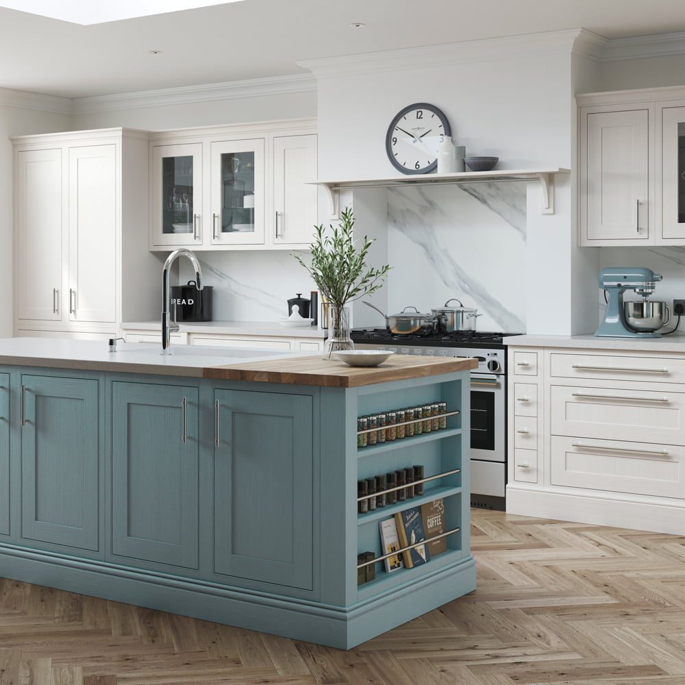 Kredit foto: DESAINER DAPUR; Shaker English revival shaker dalam Teal Mist dan Chalk White, dengan pegangan stainless steel.