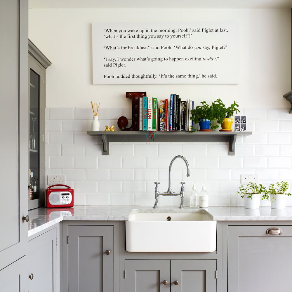 Bintang utama dari dapur abu-abu yang halus ini adalah karya seni penjualan. Anda tidak akan pernah salah mengutip Winnie the Pooh dan teman-teman. Ini adalah pesan klasik untuk perasaan senang dan motivasi. Teks sederhana adalah cara yang bagus untuk menambahkan sentuhan kepribadian ke dinding di dapur dan ruang makan. Ini topik percakapan yang ideal.