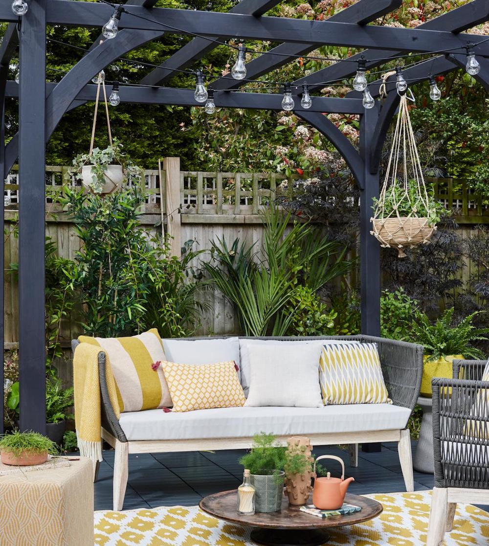 Setelah aman, mengecat pergola matt hitam Anda akan membuatnya menonjol. Maka sempurna untuk mengimbangi furnitur rotan, keranjang gantung macrame, dan rangkaian lampu untuk bersenang-senang di malam hari di luar.