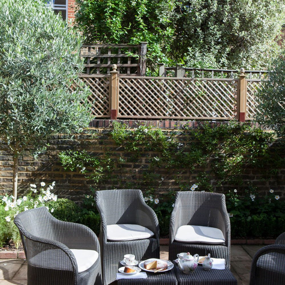 Gunakan kisi-kisi yang dicat untuk membagi area taman Anda – misalnya di sini di mana area makan luar ruangan telah dibatasi. Desain linier kompak dalam warna abu-abu trendi ini menciptakan dinding dekoratif yang membungkus area tempat duduk. Bawalah pot semak yang cukup besar untuk menegaskan ruang. Pengaturan yang nyaman seperti ini dapat memberikan perlindungan, perlindungan, dan bayangan berbintik dari cuaca Inggris yang lebih tidak terduga.