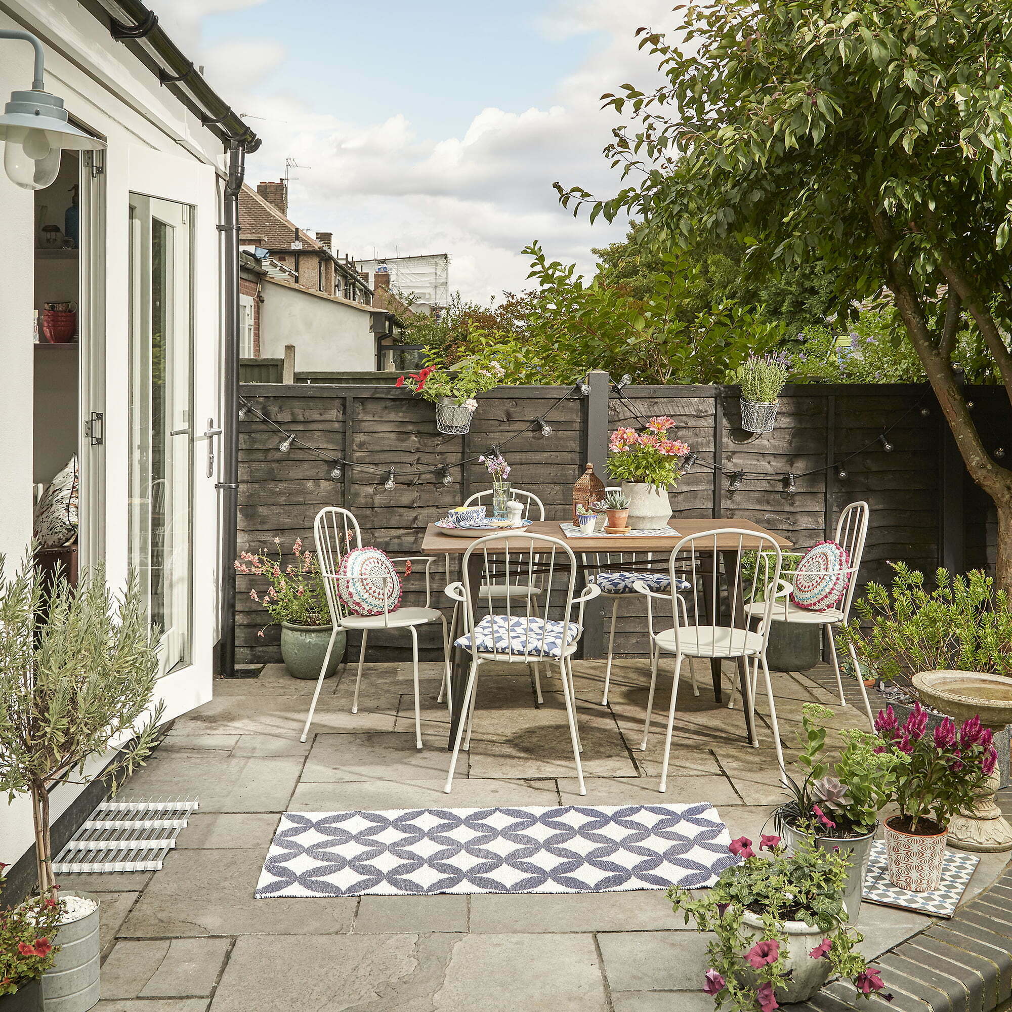 Mengapa tidak menggunakan ubin berpola untuk menciptakan ide karpet luar ruang yang lebih permanen? Letakkan pola Anda terlebih dahulu, atur furnitur taman Anda di sekitar bagian ubin berpola persegi atau persegi panjang. Ini akan membuat ‘permadani’ jauh lebih tahan lama – Anda menambahkan warna dan pola ke lantai melalui ubin.