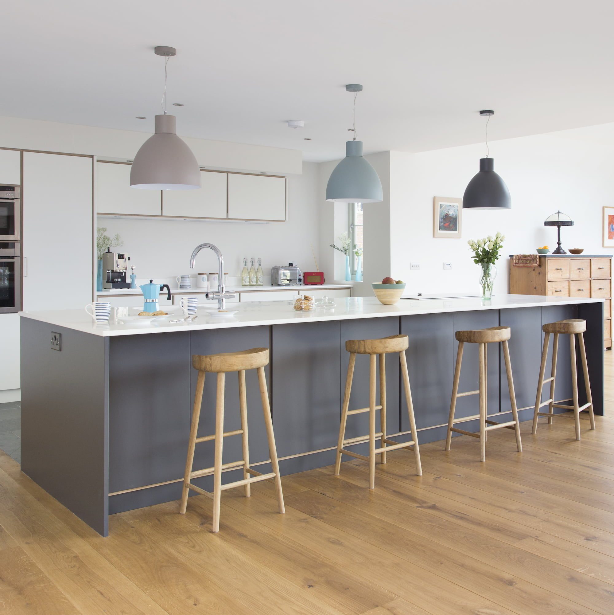 Di dapur netral, padukan dengan trio liontin skala besar dengan warna es krim yang berbeda. ‘Kumpulan liontin dalam jumlah ganjil dapat membuat tampilan yang menarik,’ kata Marketa Rypacek, direktur pelaksana, Industville. ‘Salah satu kesalahan paling umum dengan pencahayaan pulau dapur adalah orang menjadi terlalu kecil. Cobalah bermain dengan ketinggian, bentuk, dan corak yang berbeda untuk tampilan yang unik.