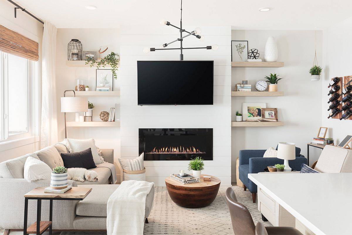 Apakah menurut Anda sesuatu yang terasa seperti kekacauan di ruang tamu Anda adalah suatu keharusan dan Anda hanya perlu mencari ceruk kecil lain untuk semua itu? Jangan khawatir, rak tambahan, lemari, dan unit mandiri dapat membantu. Dinding rak buku di latar belakang adalah ide populer di ruang tamu modern. Serta, rangkaian rak terbuka yang luas ini juga dapat menampung elemen dekoratif lainnya, meskipun pencahayaan cerdas menambah suasananya.