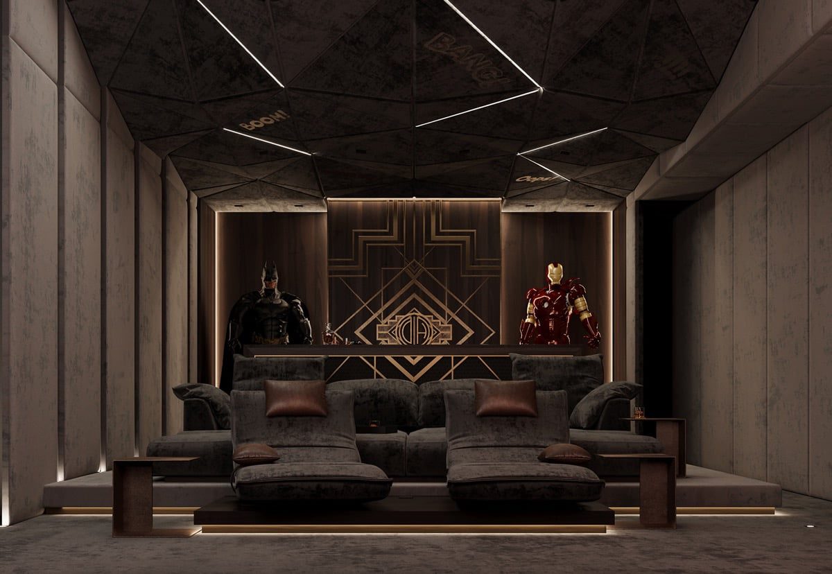 Di belakang home theater bertema buku komik, patung-patung Marvel dan DC seukuran aslinya tampak misterius di sayapnya. Dinding fitur yang dipesan lebih dahulu berkilau dibuat dengan tatahan emas.