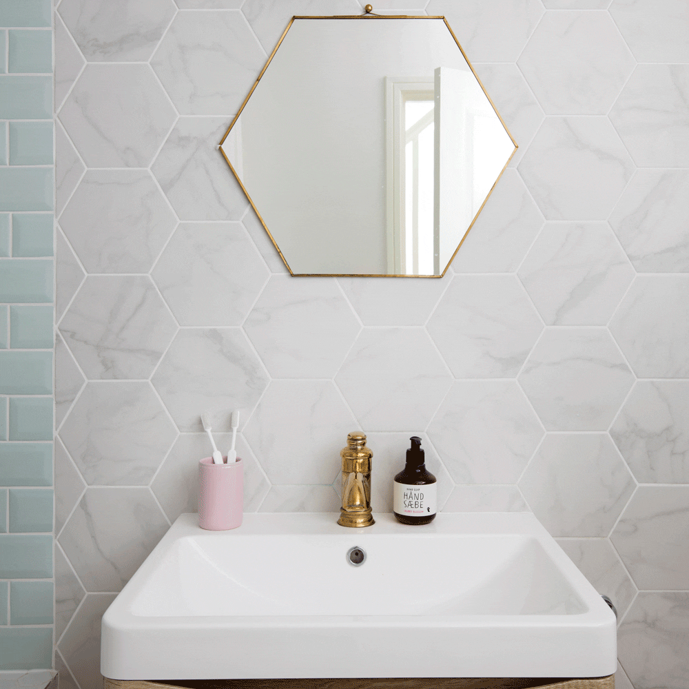 Ubin heksagonal menambahkan tampilan segar dan modern ke kamar mandi mana pun. Biarkan efek sarang lebah menjadi pusat perhatian jika saya tetap menggunakan palet netral seperti putih. Untuk faktor wow ekstra itu, pilih efek marmer seperti ubin ini.