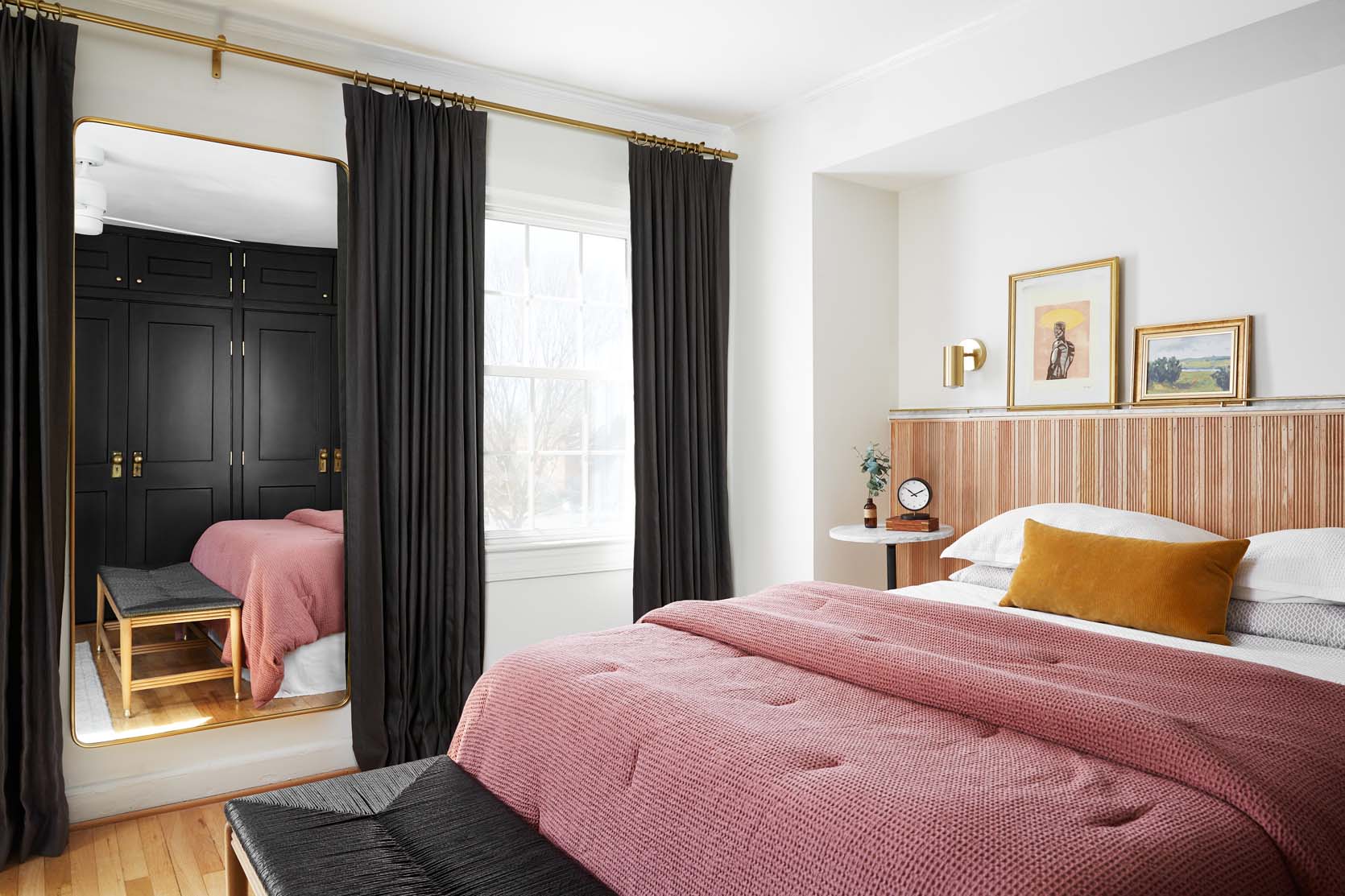 Untuk perombakan kamar tidur Julie, ia menempatkan cermin sempit panjang dengan Rejuvenation di dinding antara lemari dan pintu kamar tidur. Ini membantu memecah dinding kosong dengan cara yang sangat sederhana namun kuat. Karena cermin ini menghadap langsung ke dinding dengan jendela, cahaya alami memantulkannya dengan mudah, yang selalu merupakan hal yang baik di kamar tidur yang lebih kecil. Saya juga harus memperhatikan bagaimana dia memilih cermin berbingkai hitam matte sehingga benar-benar muncul di dindingnya yang berwarna terang dan melengkapi aksen hitam yang dia taburkan di seluruh ruangan.