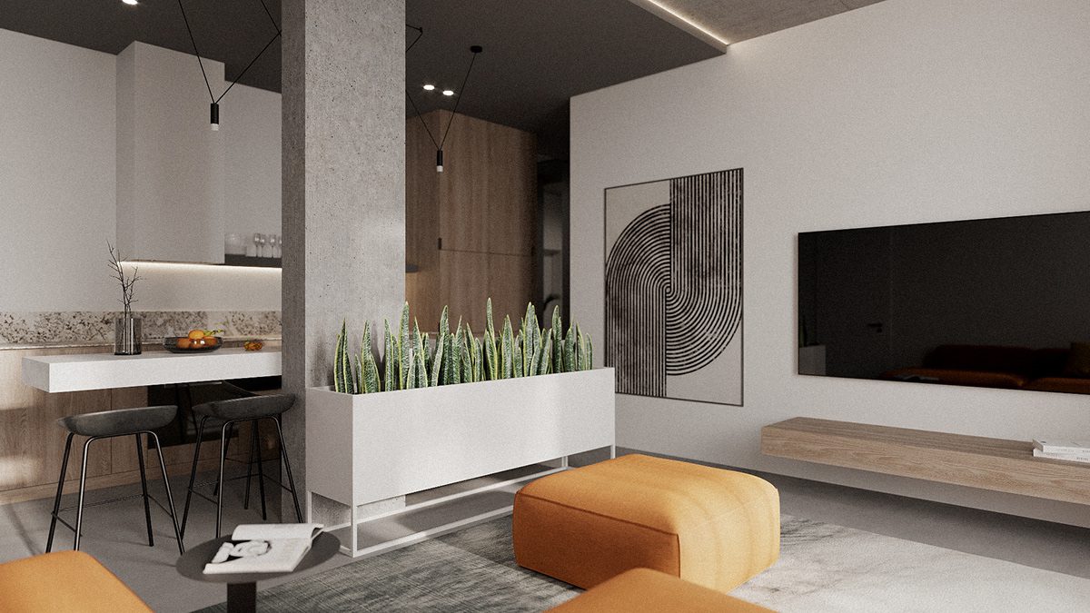 Karya seni monokrom menggantungkan ketertarikan visual pada ruang tamu minimalis. Langit-langit beton mentah dan kolom pendukung beton terbuka menambah getaran industri.