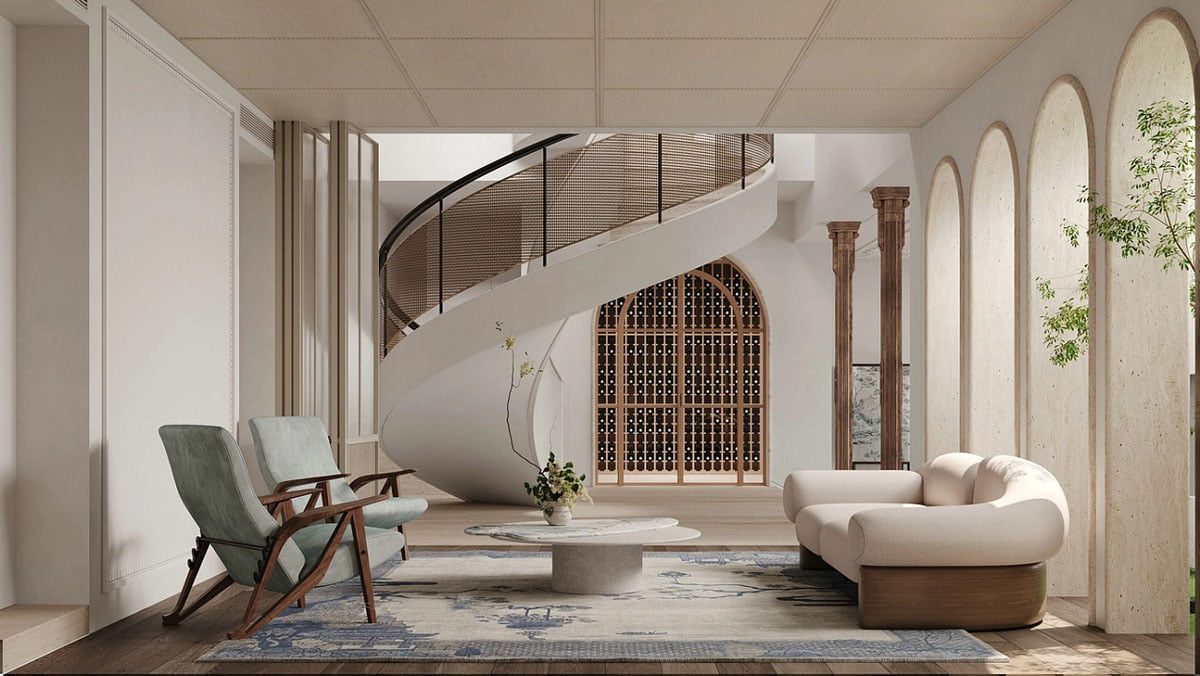 Tangga spiral melengkung ke bawah melalui ruang tamu, menciptakan bagian fokus yang berwibawa. Jendela melengkung menghadirkan sinar matahari alami, yang jatuh di atas kursi beraksen biru muda dan sofa putih modern.
