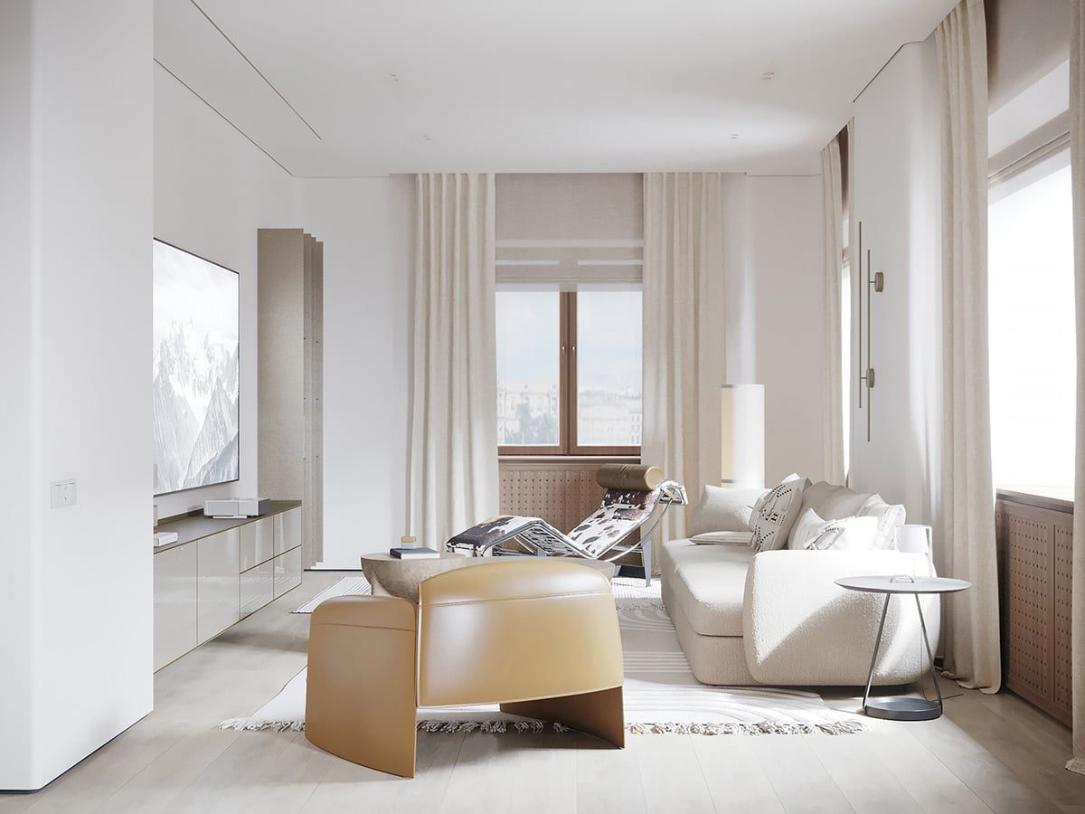 Ruang tamu memiliki proporsi yang sederhana, meskipun tampak luas berkat skema warna terang dan jendela aspek ganda yang besar.