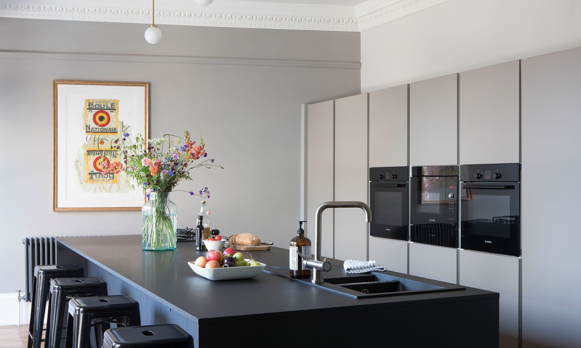 Pulau ini dan permukaan kerja ditutupi dengan Fenix. Bahan inovatif ini memiliki lapisan luar yang tidak berpori sehingga tahan panas dan gores. Itu juga dapat dililitkan di sekitar laci, lemari, dan area splashback untuk tampilan yang mulus, dengan sejumlah besar warna yang tersedia.