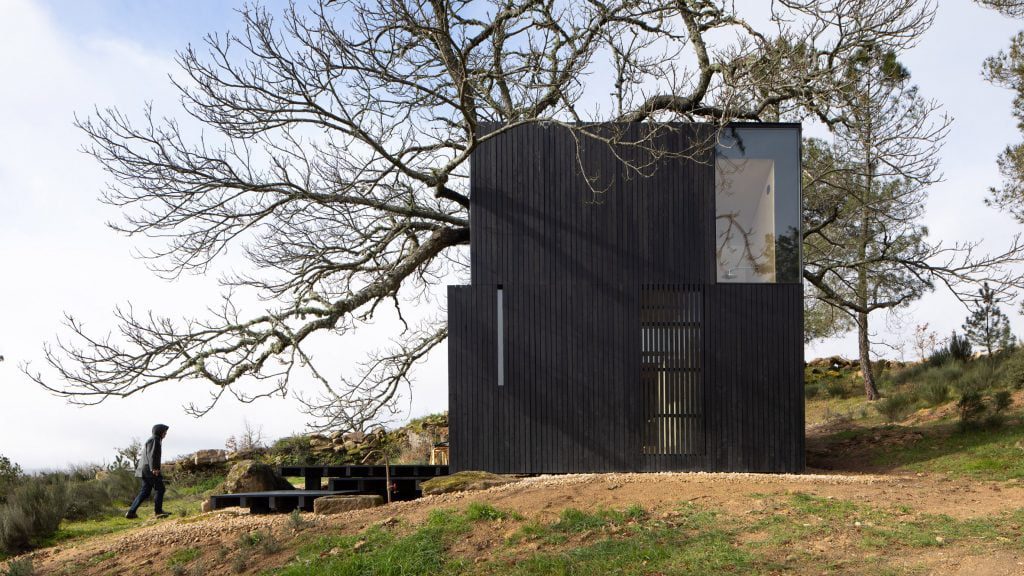 Dibalut kayu dicat hitam dan dilapisi dengan panel kayu lapis, hunian ini dirancang oleh Ribeiro sebagai “tempat berlindung yang elegan” di lanskap pedesaan.