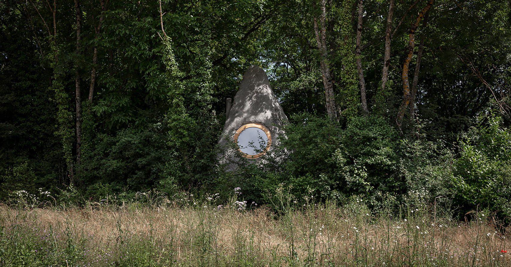 Biro studio arsitektur telah menggunakan pelapis beton kasar untuk menyamarkan kabin kayu kecil di Prancis ini sebagai batu besar, hanya dapat dibedakan dengan jendela bergaya jendela kapal.