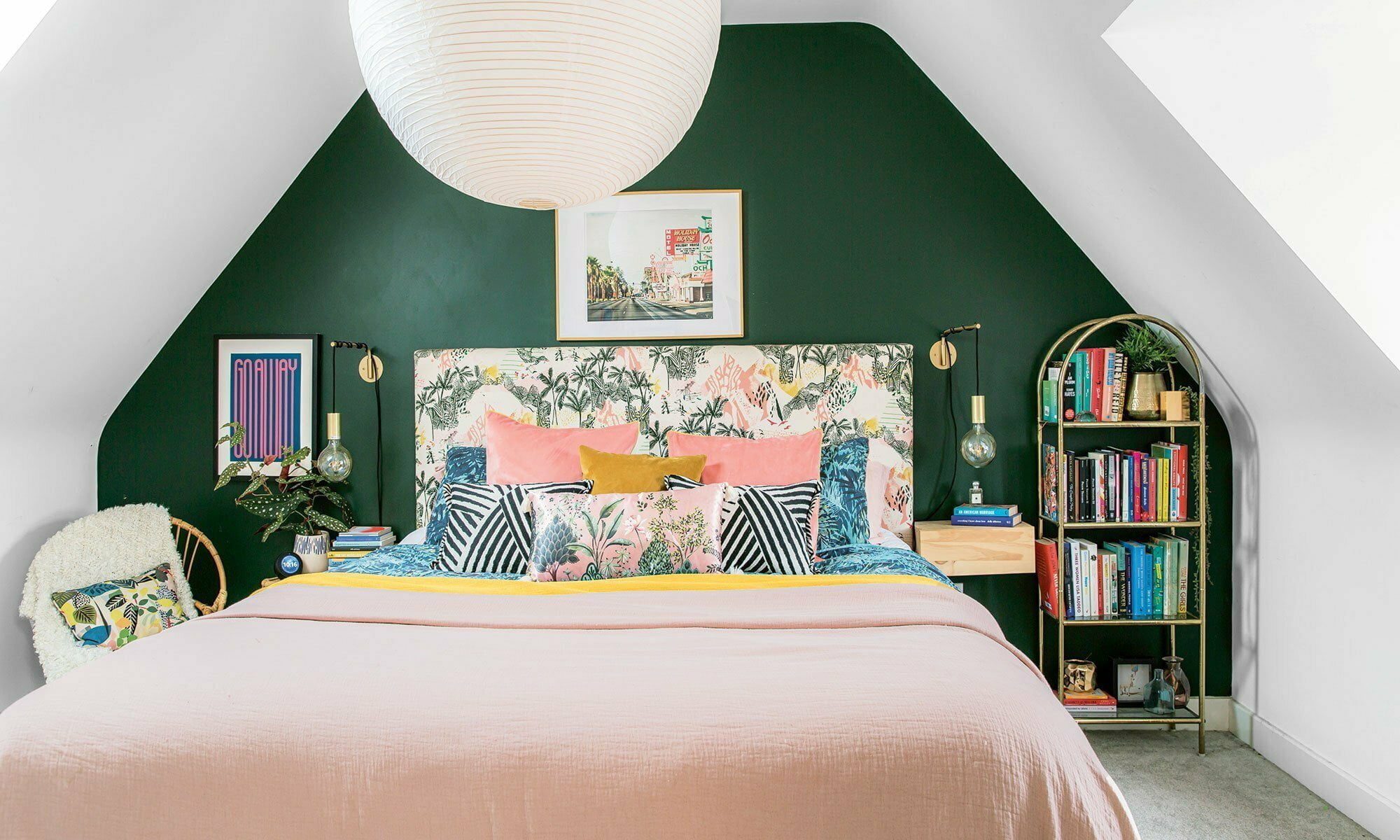 Tempat tidur telah dilapisi dengan banyak bantal dan lemparan yang saling berbenturan, yang benar-benar menonjol di dinding kepala tempat tidur yang dicat. Ide headboard DIY telah didaur ulang dengan beberapa meter kain dari Kitty McCall.