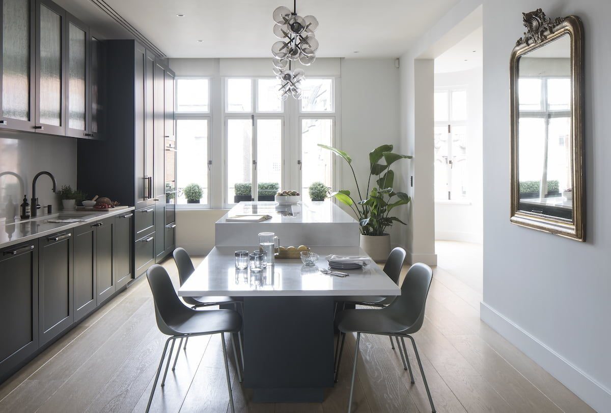 Pemiliknya menghubungi desainer interior Stephanie Rackkind untuk mempertimbangkan kembali tata letaknya. Semuanya cocok saat dia menyarankan Mengerjakan seluruh ruangan dengan mendesain dapur dengan meja makan kantilever panjang yang terintegrasi ke dalam pulau tengah yang membentang di sepanjang ruangan.