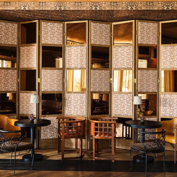 Meja-meja kecil dan kursi-kursi yang tidak serasi diposisikan di ceruk, di depan panel lipat dengan kotak-kotak cermin emas dan motif bunga di dalam bingkai kayu.