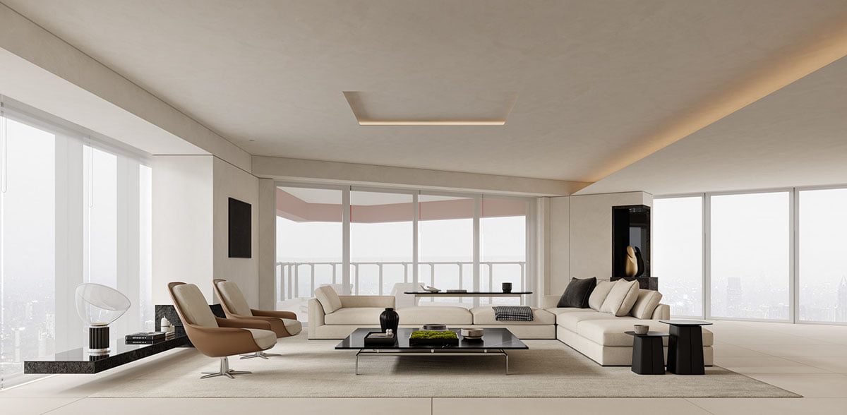Elemen dekorasi hitam dan putih kontras tinggi, ditambah instalasi lampu kontras yang berseni menciptakan rumah mewah dengan esensi yang unik. Divisualisasikan oleh 梦太初, apartemen luas ini halus, elegan, dan penuh dengan pernyataan gaya. Terlepas dari palet warnanya yang singkat, desain interiornya menyampaikan estetika yang tajam, cocok untuk para profesional yang tinggal di kota yang suka tampil mengesankan. Ruang tamu terbuka dengan ruang makan formal kondusif untuk menghibur dalam skala besar. Dapur menawarkan pengalaman bersantap formal lainnya, di mana koki dapat membuat tamu terkesan dengan keterampilan mereka dan bergabung dalam percakapan. Lorong atmosfer mengarah ke kamar tidur, yang memiliki estetika yang minimalis dan luar biasa.