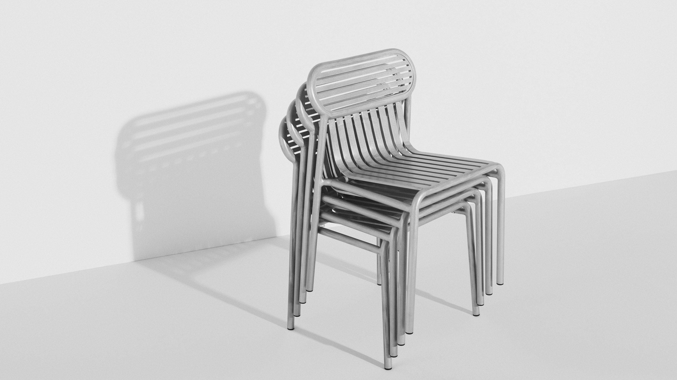 Furnitur luar ruangan Aluminium Week-End memiliki siluet koleksi asli – dirilis pada tahun 2017 – dengan sentuhan akhir warna perak yang merayakan materialitas rangkaian tersebut.