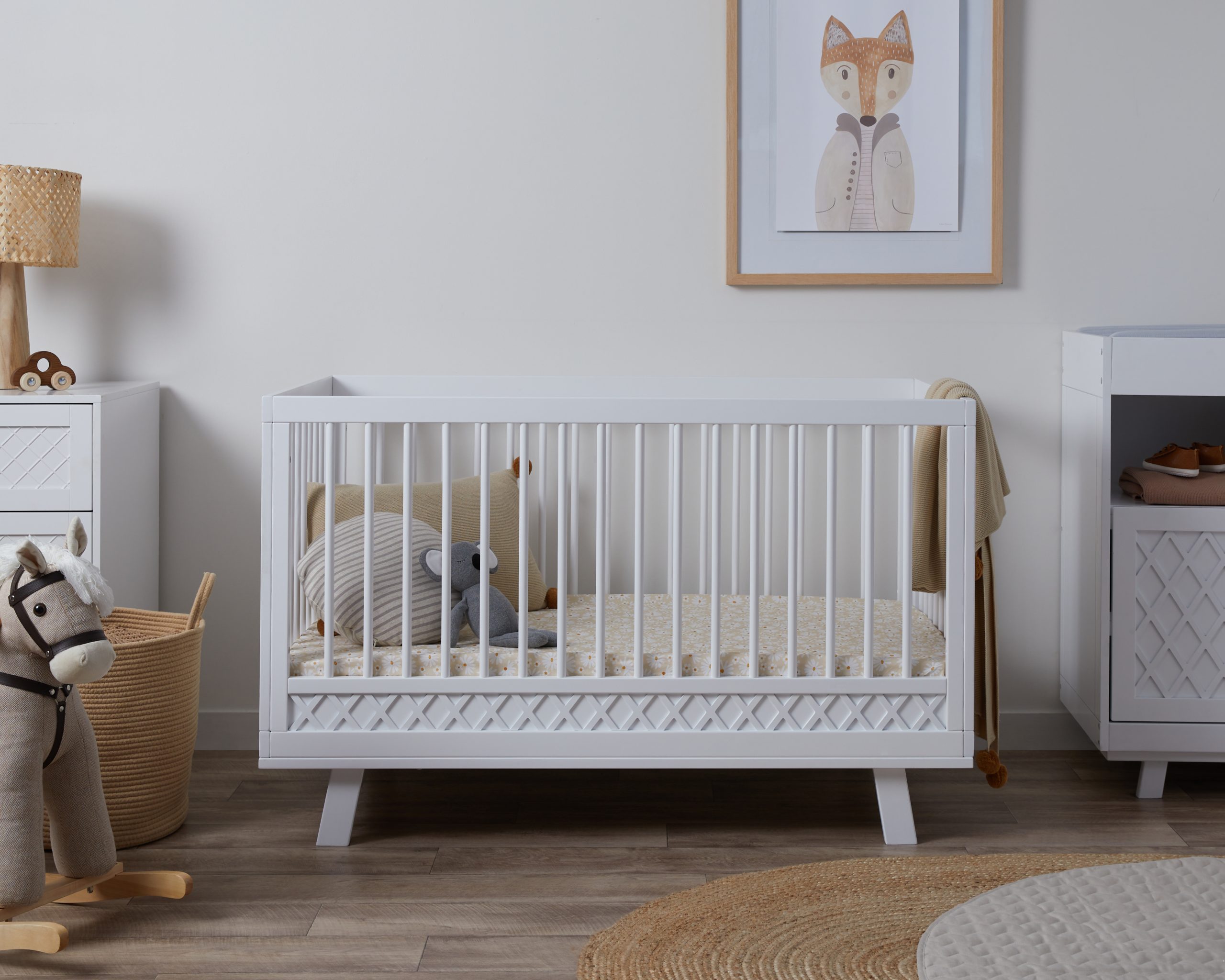 Ini adalah kombinasi sempurna dari desain tradisional yang ditinggikan oleh perincian silang dan perangkat keras emas, dan ada dipan, meja ganti, meja samping tempat tidur, dan lemari enam laci untuk dipilih.