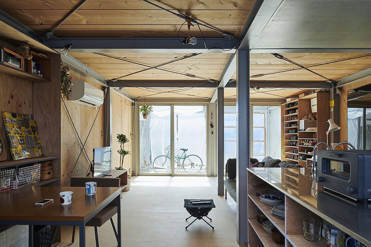 Ini adalah bingkai kotak yang membentuk dasar konsep rumah jepang Modern ini, dengan dinding kayu, lantai dan langit-langit ditambahkan secara bertahap sesuai dengan gaya hidup pemilik rumah. Dinding dapat dipindahkan dan bahkan diatur ulang sepanjang garis untuk menggabungkan atau memisahkan ruangan, menciptakan ruang yang lebih besar dan lebih terbuka atau ruangan dengan privasi lebih. Semua ini dilakukan dengan anggaran yang ketat dan di lahan perkotaan yang padat sambil memaksimalkan setiap inci ruang yang tersedia. Rak pintar, lembaran polikarbonat yang menyaring sinar matahari, dan denah lantai yang unik memastikan hunian Jepang ini berfungsi!