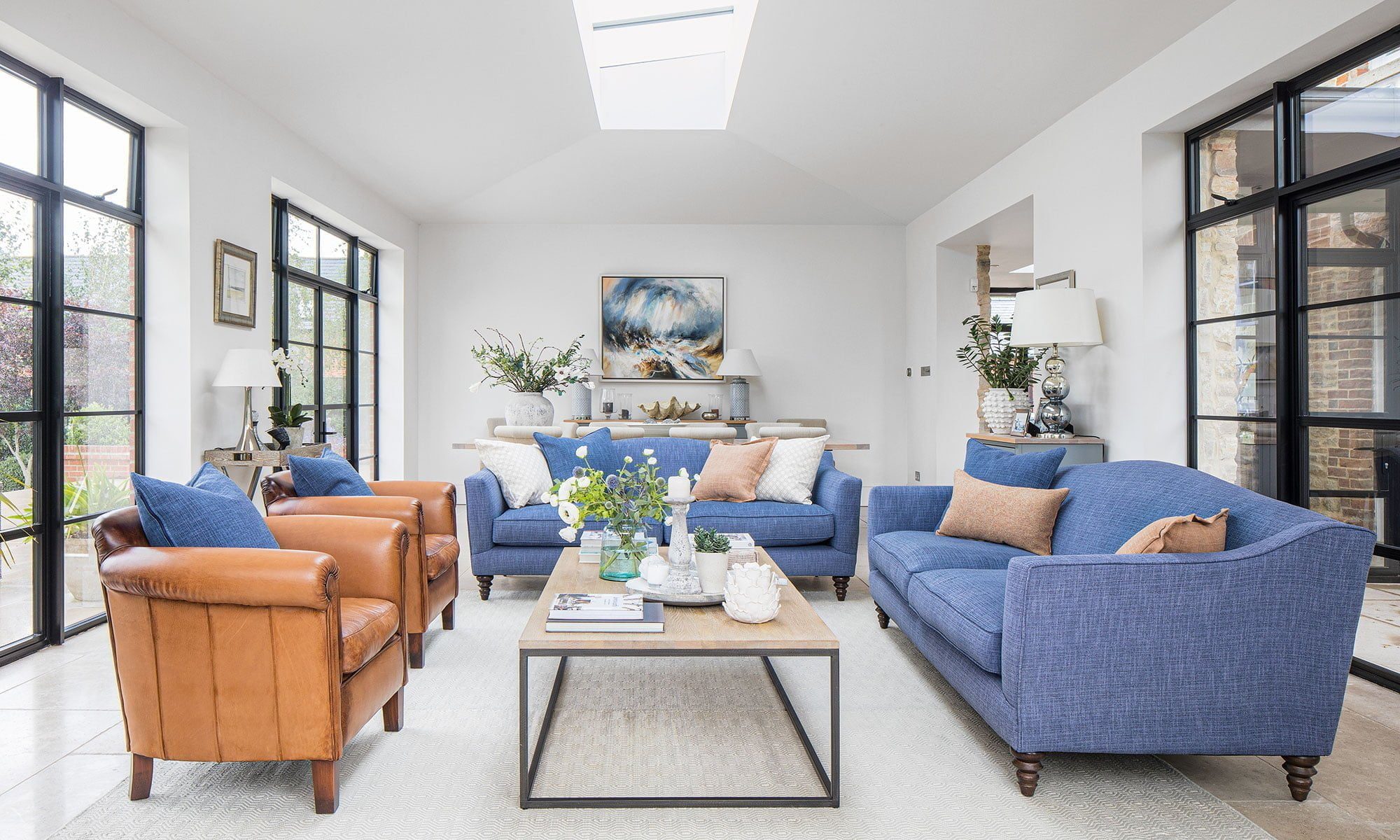 Ruang duduk berada di ekstensi, yang memiliki langit-langit mencolok dengan skylight panjang.
