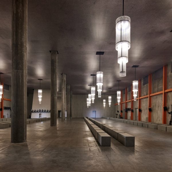 Lampu gantung mengungkapkan keseluruhan ruangan dan balok struktural bercat oranye yang mengapit dinding Deposito serta pita dan lantai bertanda instalasi dari set pertunjukan Prada sebelumnya, seperti pertunjukan Musim Semi Musim Panas 2019, dan berbagai pameran.