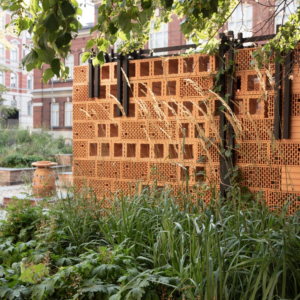 Duo arsitektur Suomi dan Koivisto mengatur struktur geometris di seluruh halaman untuk menciptakan campuran tempat duduk dan jalur yang menyertai tas tumbuh besar yang diisi dengan lebih dari seribu spesies tanaman.