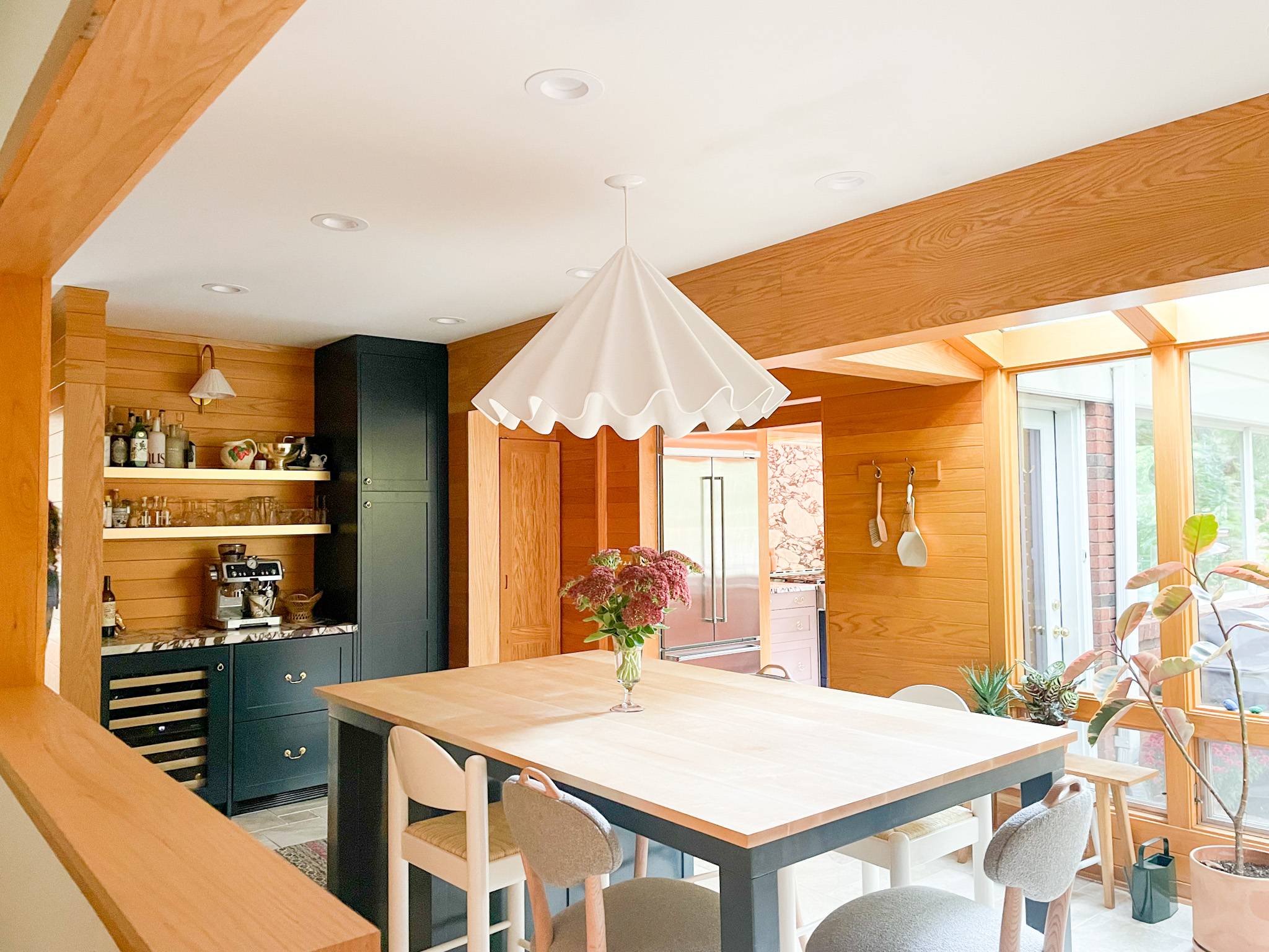 Untuk desain akhir, Arends mendapat inspirasi dari kunjungannya baru-baru ini ke Jackson Hole dan Paris. Desain yang dihasilkan memiliki kehangatan yang akan Anda temukan di ruang perhotelan premium, tetapi dengan keintiman dapur makan. Elemen modern seperti panel kayu berpadu dengan desain tradisional bagian rumah lainnya dan diimbangi dengan detail hiasan seperti lantai marmer. Arends memilih bagian depan kabinet yang dapat dicat dan Farrow & Ball’s Sulking Room Pink dan Hague Blue untuk palet terakhir.