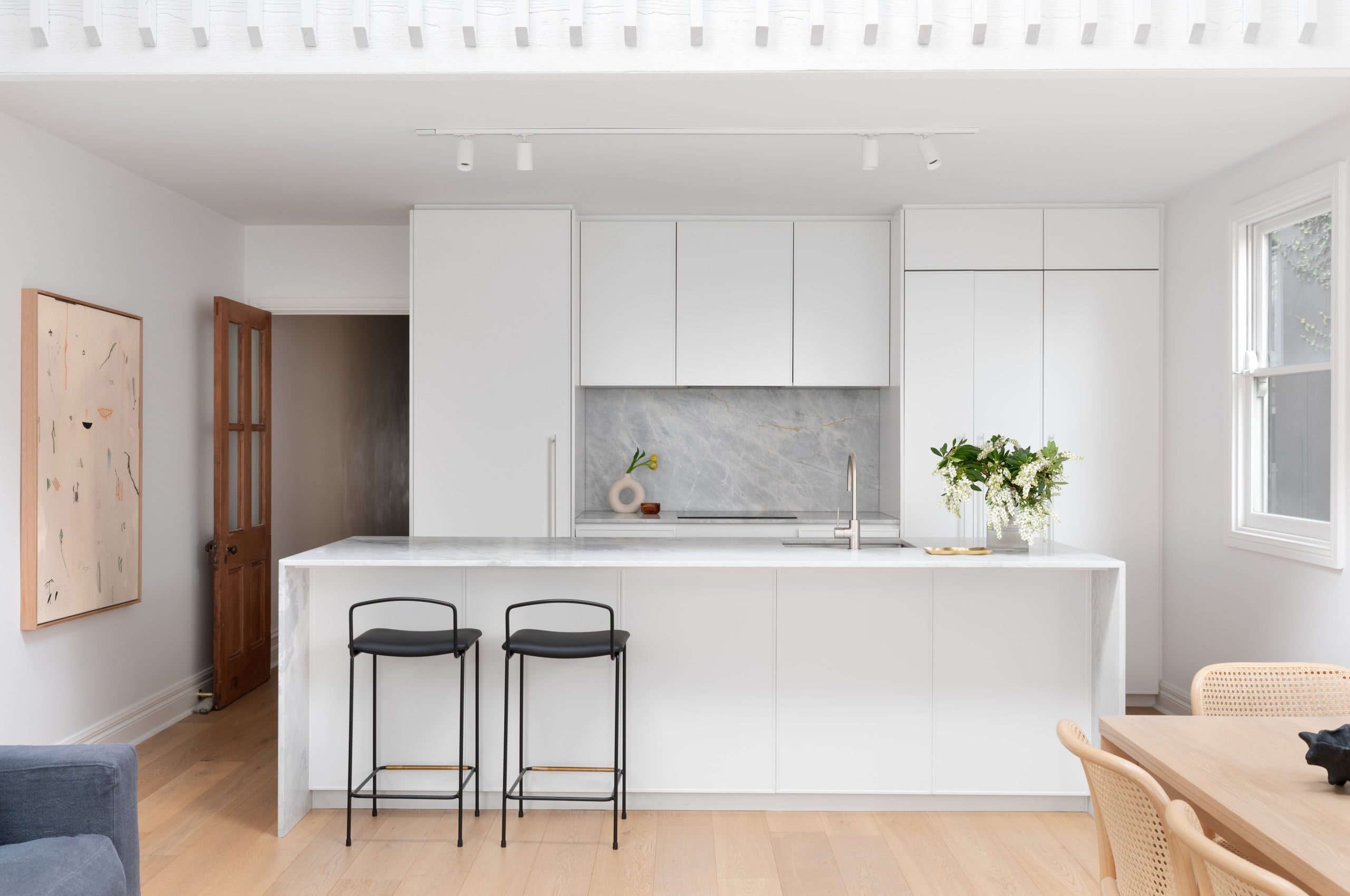 Proyek lain oleh arsitek Melbourne berbakat Bonnie Mills, rumah Richmond ini baru saja direnovasi dengan estetika desain minimalis yang bersih. “Detail yang teliti dan warna yang lembut dan sejuk, menciptakan rasa memiliki dan kedamaian di dalam ruangan,” kata Bonnie Mills tentang rumah teras yang dulunya gelap dan tertutup yang menampung keluarga dengan tiga orang. Cahaya utara telah dimaksimalkan dan skema warna menjadi terang; kedua aspek tersebut membuat rumah terasa jauh lebih luas.