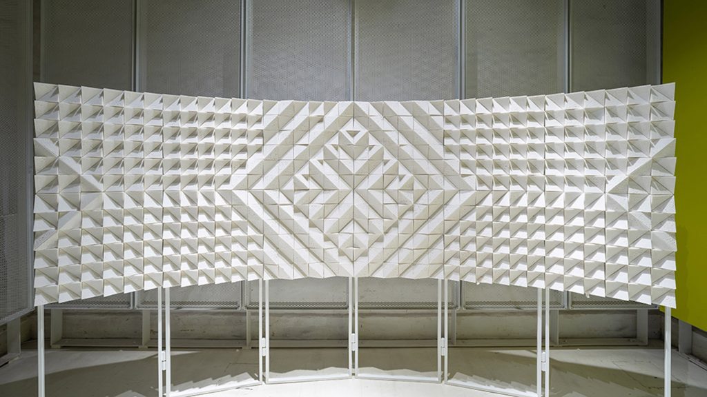 Mural ini dibuat dengan ubin individu dengan alas segitiga dalam dua bentuk terbalik, sehingga dapat diatur dalam berbagai cara untuk membuat komposisi geometris yang berbeda, “kata Uribe.