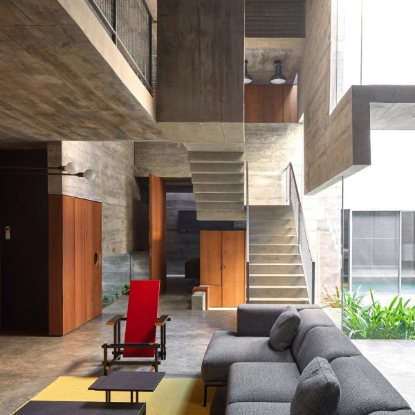 Menggambar pada tipologi halaman yang khas untuk daerah tersebut, rumah tersebut memiliki “cangkang berongga” yang keras dari beton bertanda papan yang terbuka secara internal di sekitar ruang tamu yang cerah dan halaman taman.