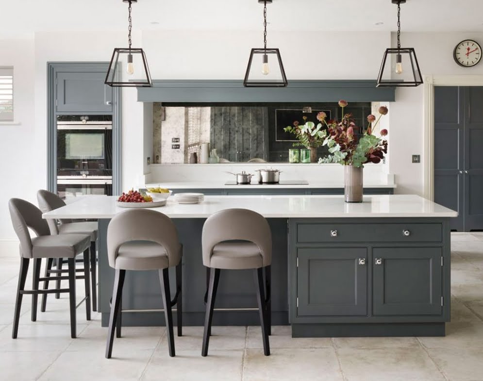 Umumnya Anda membutuhkan setidaknya 36 inci di belakang tempat duduk untuk mendapatkan kursi/bangku masuk dan keluar dari bawah meja. Juga, beri jarak setidaknya 45 hingga 60 inci jika ada catwalk di belakang kursi. Misalnya, dapur rumah pertanian dari Everingham Design ini menyisakan banyak ruang terbuka di belakang tempat duduk.