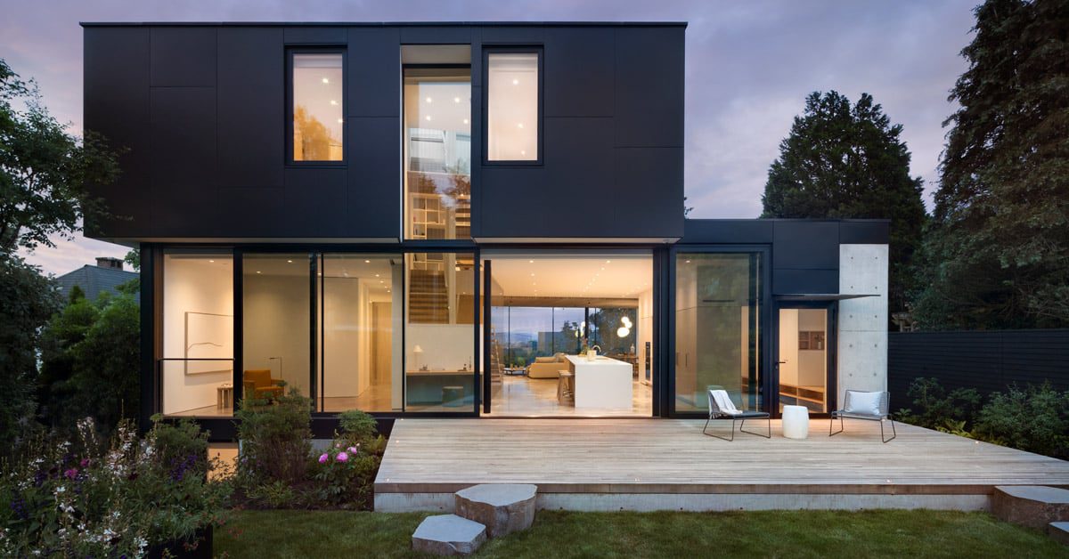 Bagian depan rumah - berfungsi seperti platform tampilan bertumpuk dengan jendela dari dinding ke dinding, dari lantai ke langit-langit - menghadap ke kota, pegunungan, dan laut, sementara sisi belakang yang tertahan membingkai pemandangan pohon cemara Douglas dan pohon aras merah barat di hutan hujan pesisir.