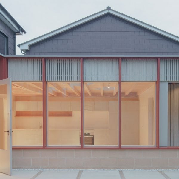 Di luar, penambahan fitur fasad seperti biara, terbuat dari sirip kayu merah dan jendela besar duduk di atas bangku blockwork berpigmen.
