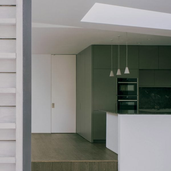 Ekstensi samping ini mengarah ke ruang tamu, ruang makan, dan dapur baru di dalam ekstensi belakang dan menciptakan sumbu visual yang menghubungkan bagian depan dan belakang hunian.
