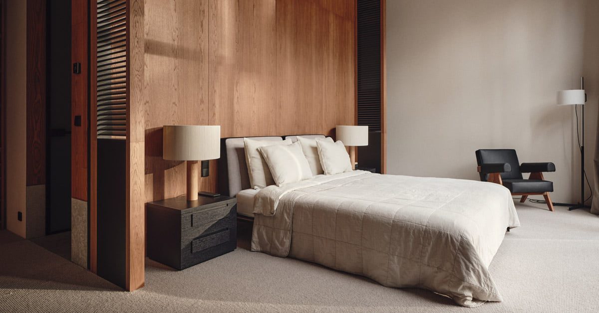 Perhatian yang cermat diberikan pada elemen-elemen seperti gagang pintu kayu untuk memastikannya ergonomis dan enak disentuh, dengan tetap mempertahankan estetika yang sederhana dan minimal.